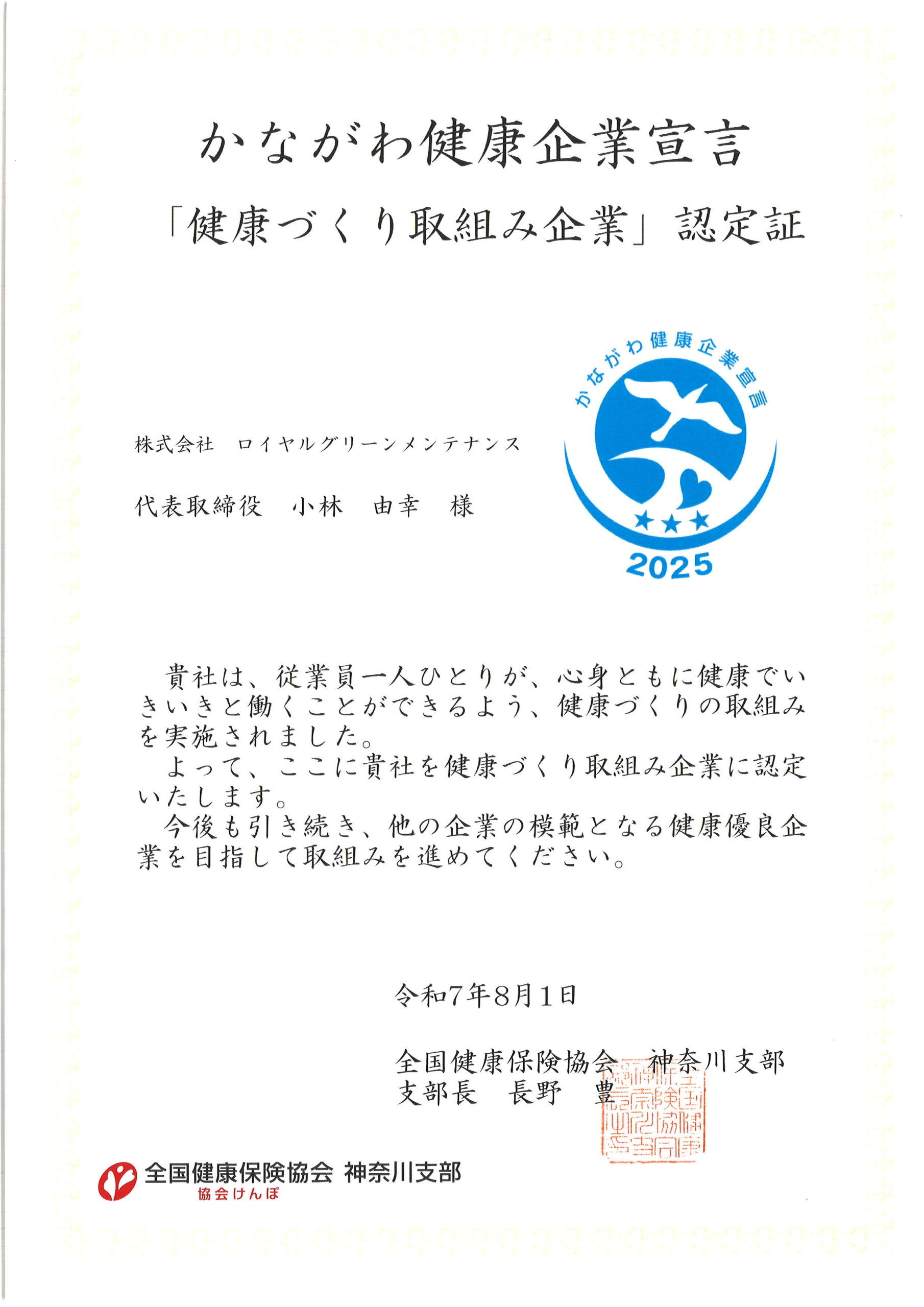 「健康づくり取組み企業」認定証 2025.09.08 お知らせ かながわ健康企業宣言「健康づくり取組み企業」に認定されました。ひきつづき、健康増進に向けて、積極的に取り組みます。※健診受診率・特定保健指導実施率に基づて認定されたものです。 「健康経営優良法人2025」認定 記事一覧 優良申告法人として表敬を受けました...