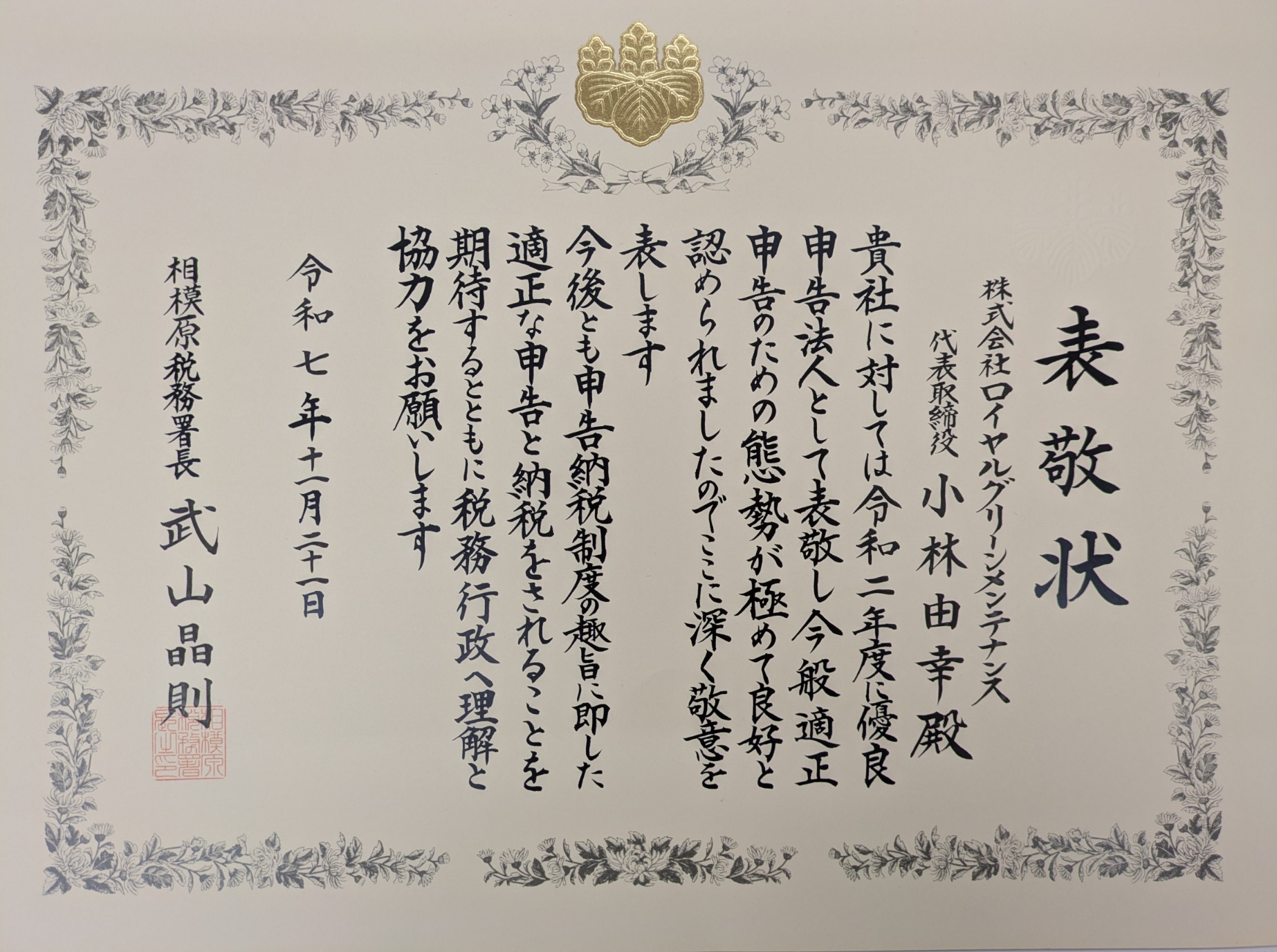 ロイヤルグリーンメンテナンスは、過去7度にわたって認定・表敬をうけております。 そして本年もまた、8回目の認定を受けることができました!